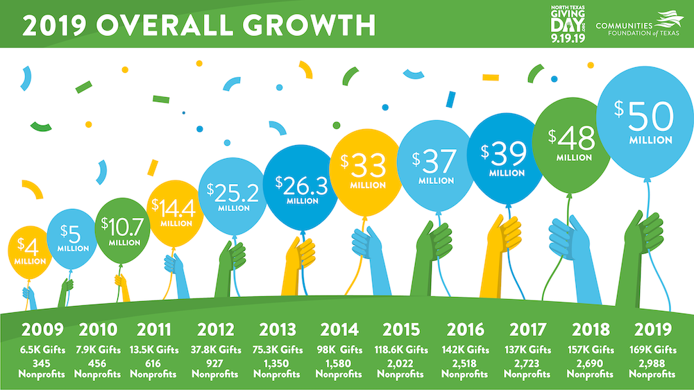 Nonprofits and the community alike have embraced this annual day of giving, and last year in 2019, $50 million was raised by 102,000 donors that benefited 3,000 local nonprofits. That brought the 11-year total raised for the community to over $290 million, making North Texas Giving Day the largest community-wide giving event in the nation.